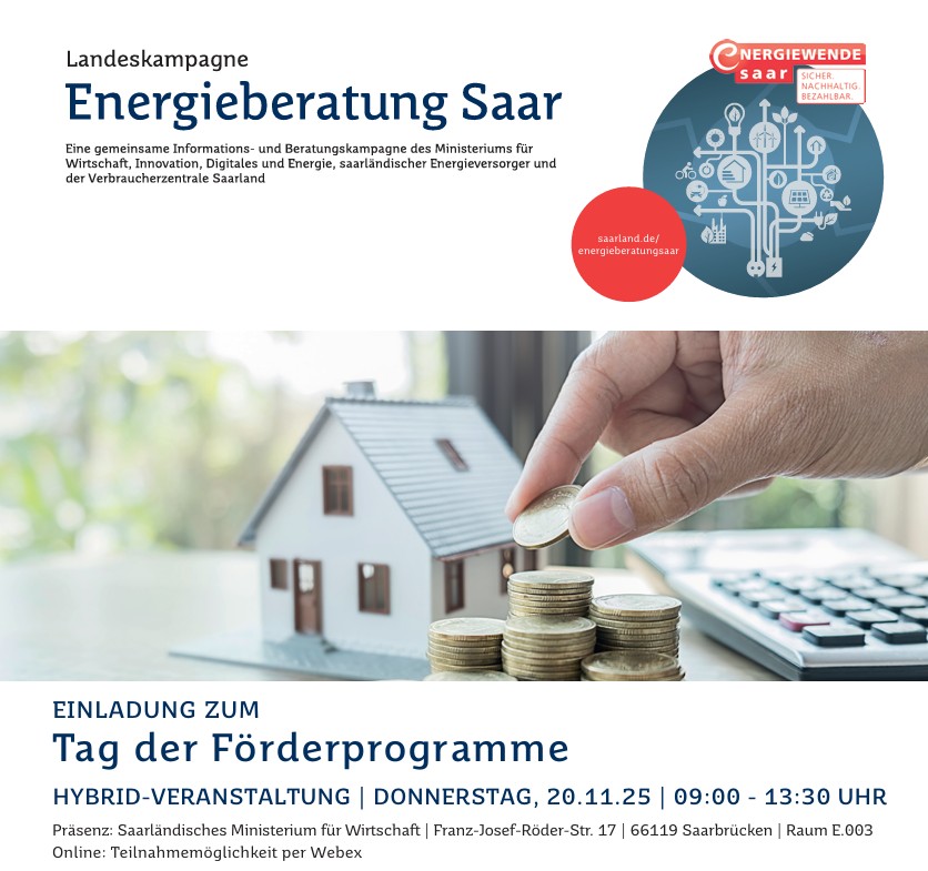 OnlineAm 19.11.25 findet die nächste Online-Sprechstunde für Kommunen und KMU von 15.00 bis 16.00 Uhr statt. Die Veranstaltung findet im Rahmen der der Landeskampagne “Energieberatung Saar” statt. Die Online-Sprechstunde richtet sich an alle Interessierten Mitarbeitenden und Verantwortlichen in Kommunen und Unternehmen, die Fragen zur Steigerung der Energieeffizienz, Einsatz Erneuerbarer Energien oder energetischen Förderprogrammen haben. Besonders angesprochen sind diejenigen, die praktisch und […]